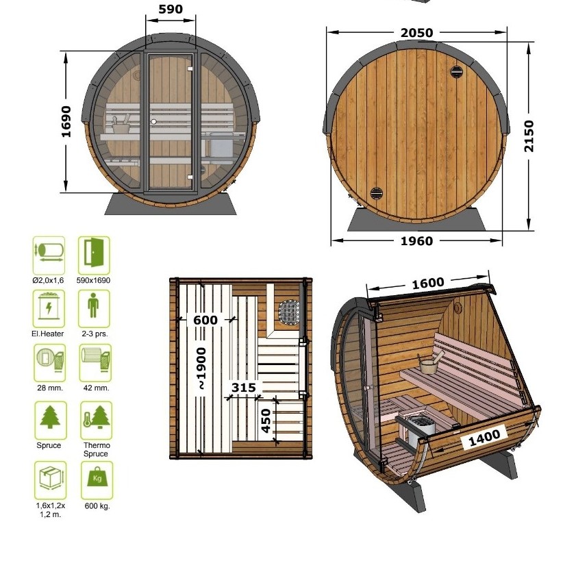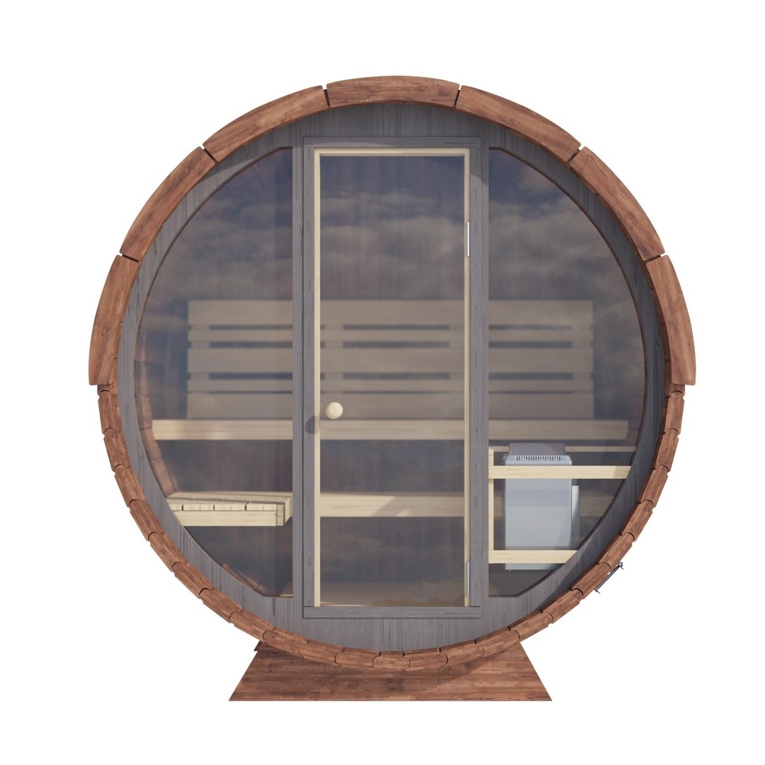 La Sauna Finlandese a botte da Esterno FJALL con pannello frontale in vetro è la scelta ideale per chi desidera unire design moderno e tradizione nordica. Realizzata in legno termotrattato certificato FSC, con ampie vetrate panoramiche e panche in ontano, offre un ambiente elegante e confortevole per 2-3 persone.