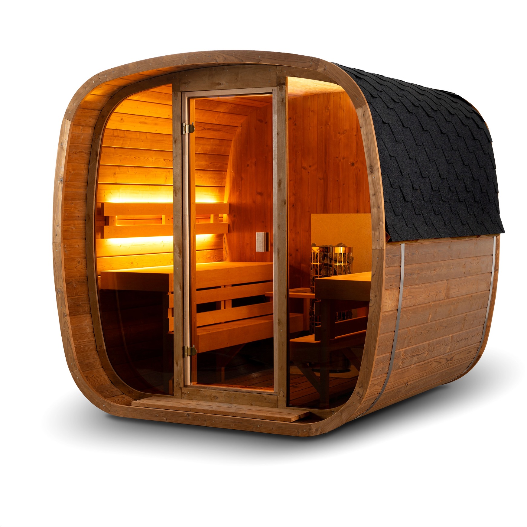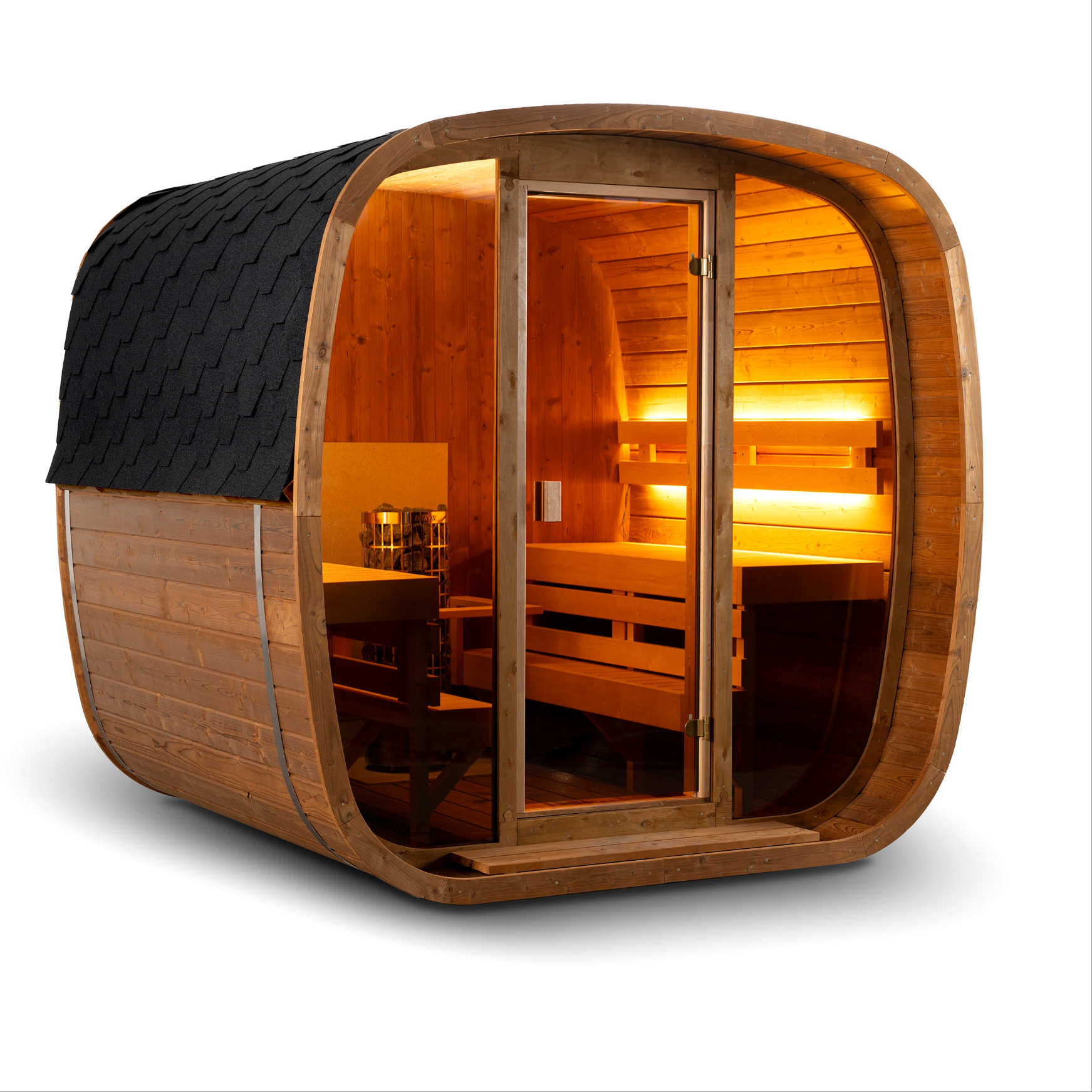La Sauna Finlandese a botte da Esterno FJORD è la scelta ideale per chi desidera unire design moderno e tradizione nordica. Realizzata in legno termotrattato certificato FSC, con ampie vetrate panoramiche e panche in frassino, offre un ambiente elegante e confortevole per 4–6 persone.
