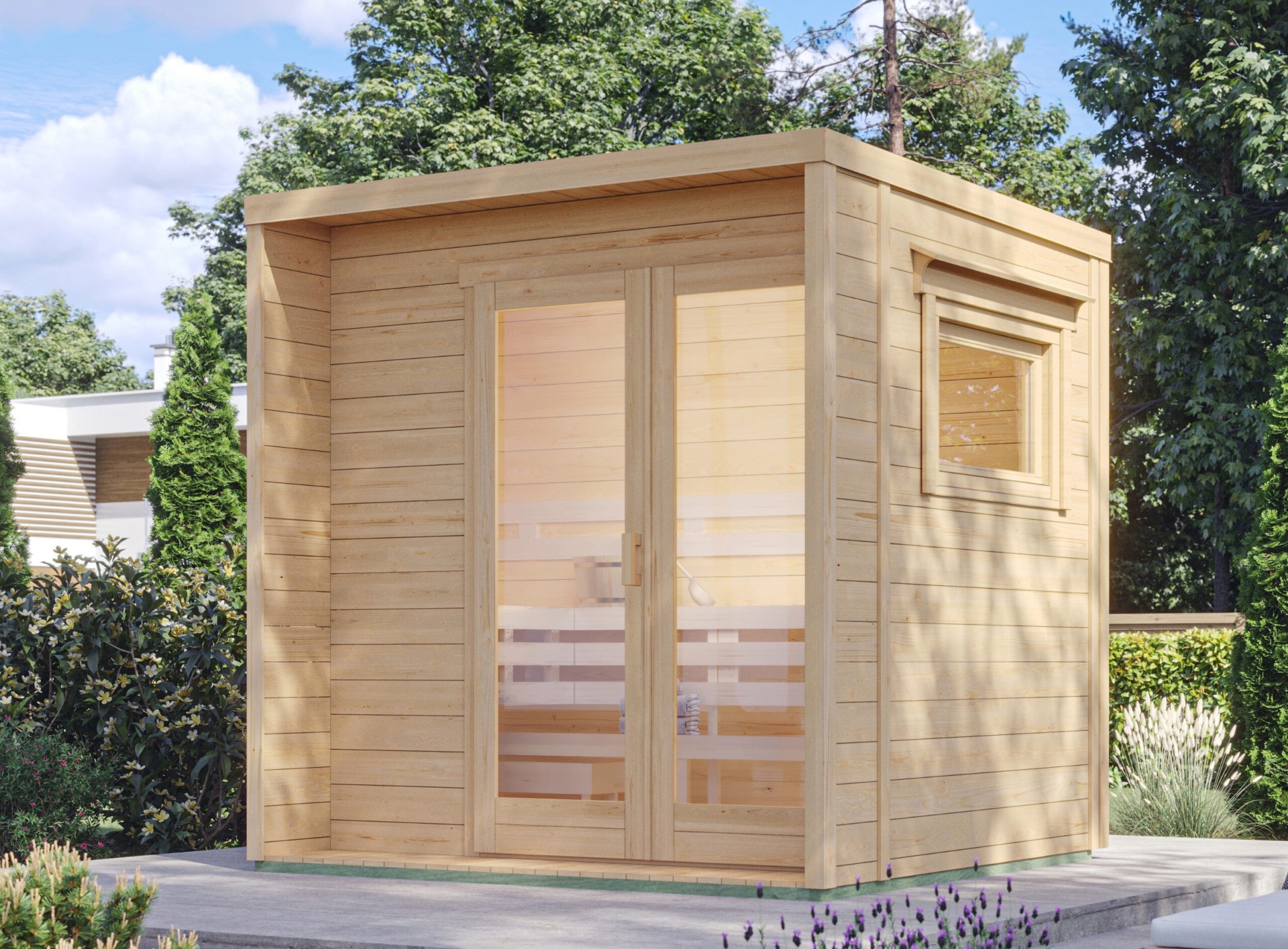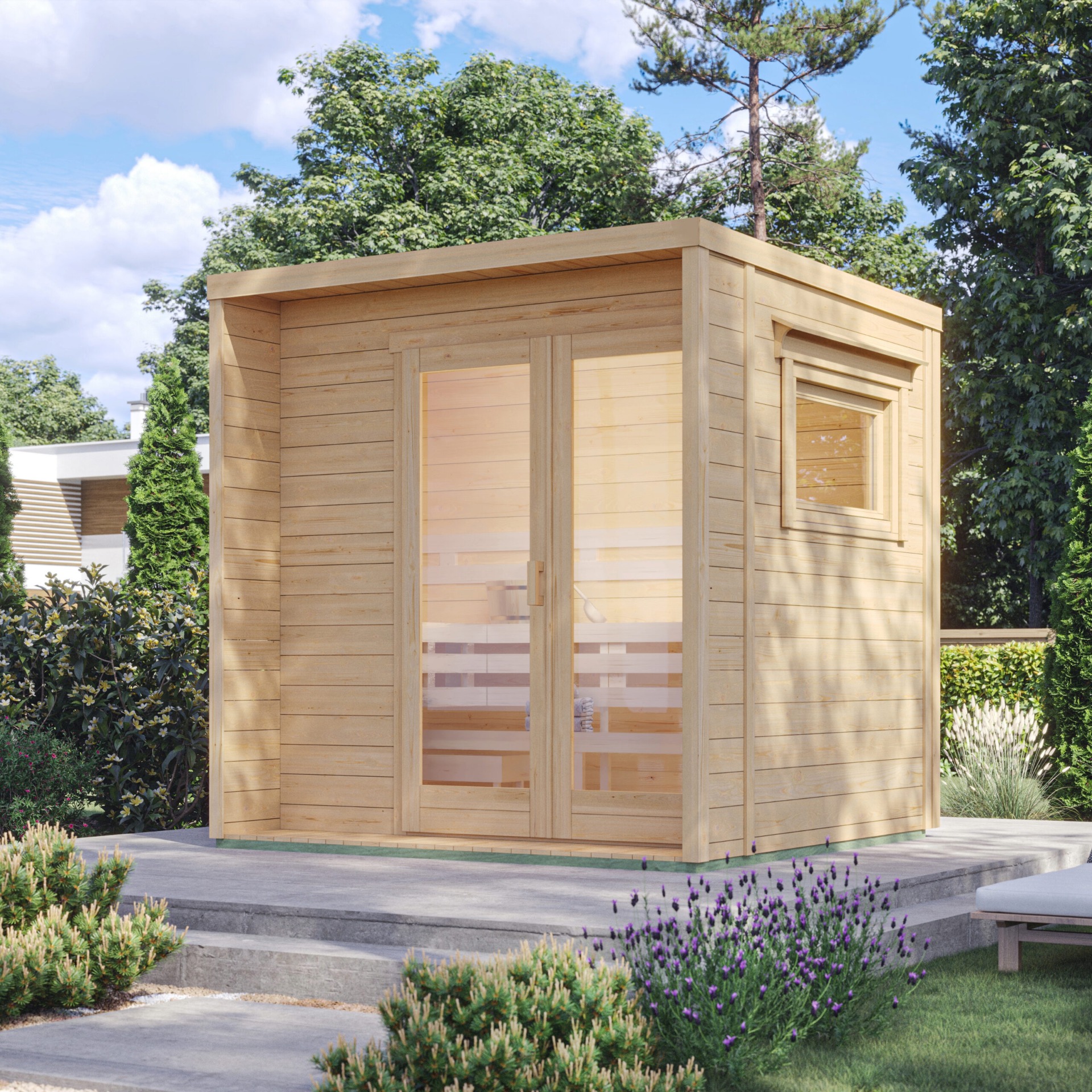 L'ampia finestra panoramica regala luminosità naturale e un'atmosfera unica, mentre il sistema di riscaldamento – disponibile con stufa elettrica o a legna Harvia – assicura un'autentica esperienza di sauna finlandese.