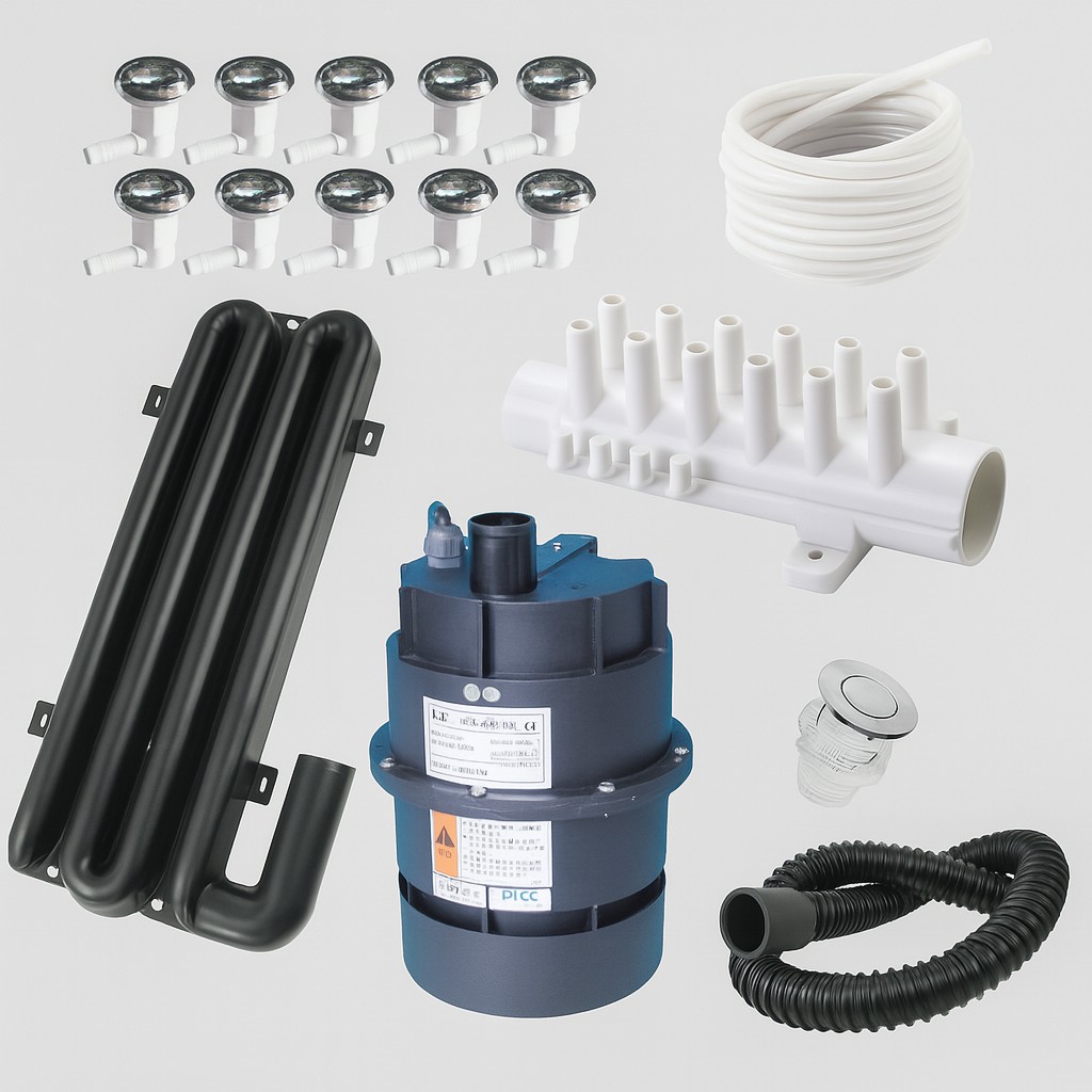 Il sistema della vasca idromassaggio è un ottimo modo per rilassare i muscoli con le bolle d'aria che salgono dal fondo. Il sistema della vasca idromassaggio comprende 12 getti e funziona ad aria. Il sistema è già installato nella vasca idromassaggio in fabbrica e viene fornito con una scatola di derivazione, da cui il cliente prende il cavo per la rete elettrica - la rete 220V e la potenza del sistema idromassaggio è di 700 W.