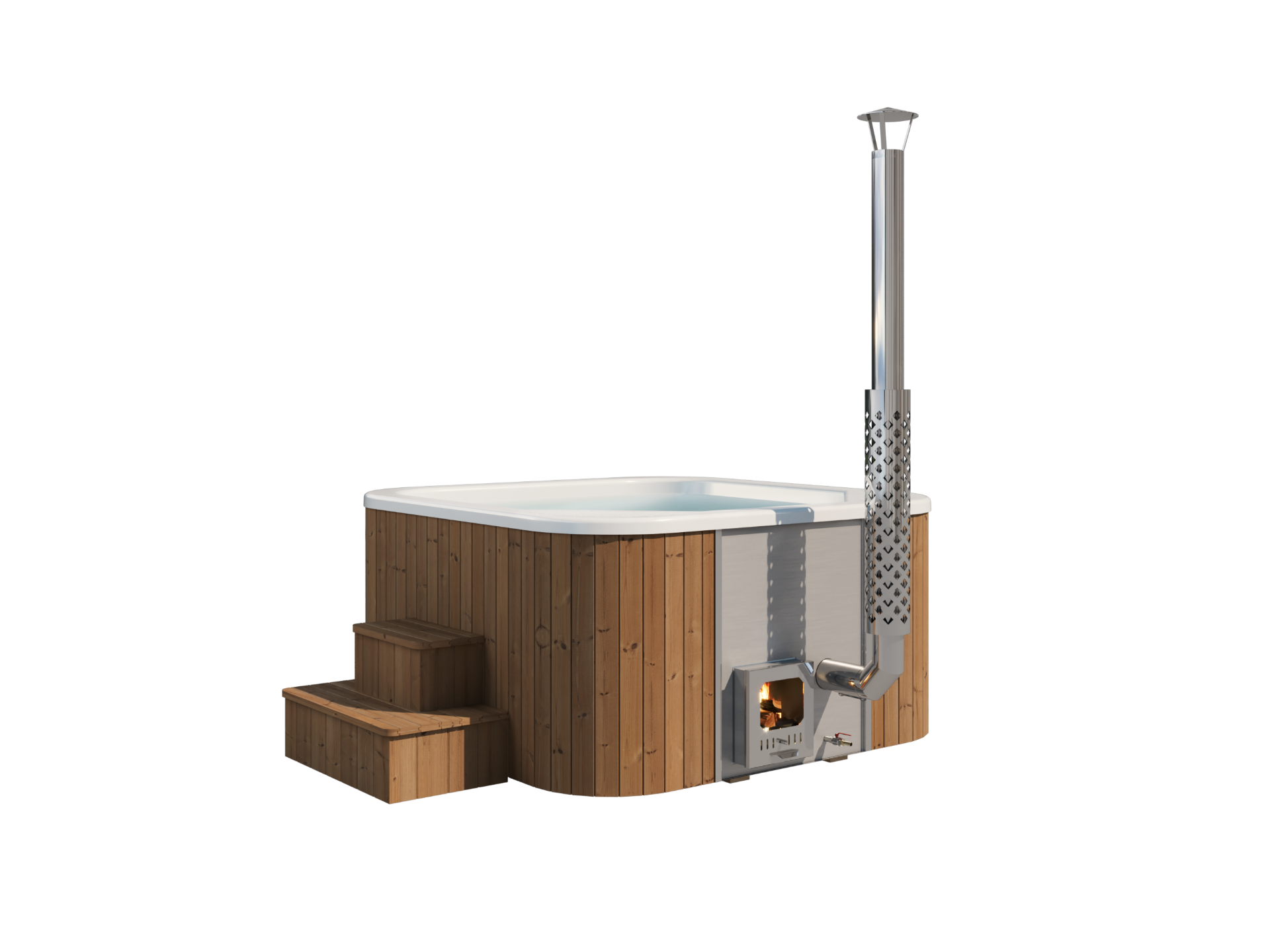 La Tinozza in legno rettangolare da Esterno TUNNA Horn 200 Premium per 6-8 persone, unisce design moderno e tradizione nordica. È realizzata in legno trattato termicamente e colorato di marrone, che conferisce alla tinozza un aspetto particolarmente elegante e naturale. Dotato di una vasca interna in vetroresina, stufa a legna integrata e canna fumaria. Ideale per chi cerca una sauna di lusso da giardino, resistente e sostenibile.