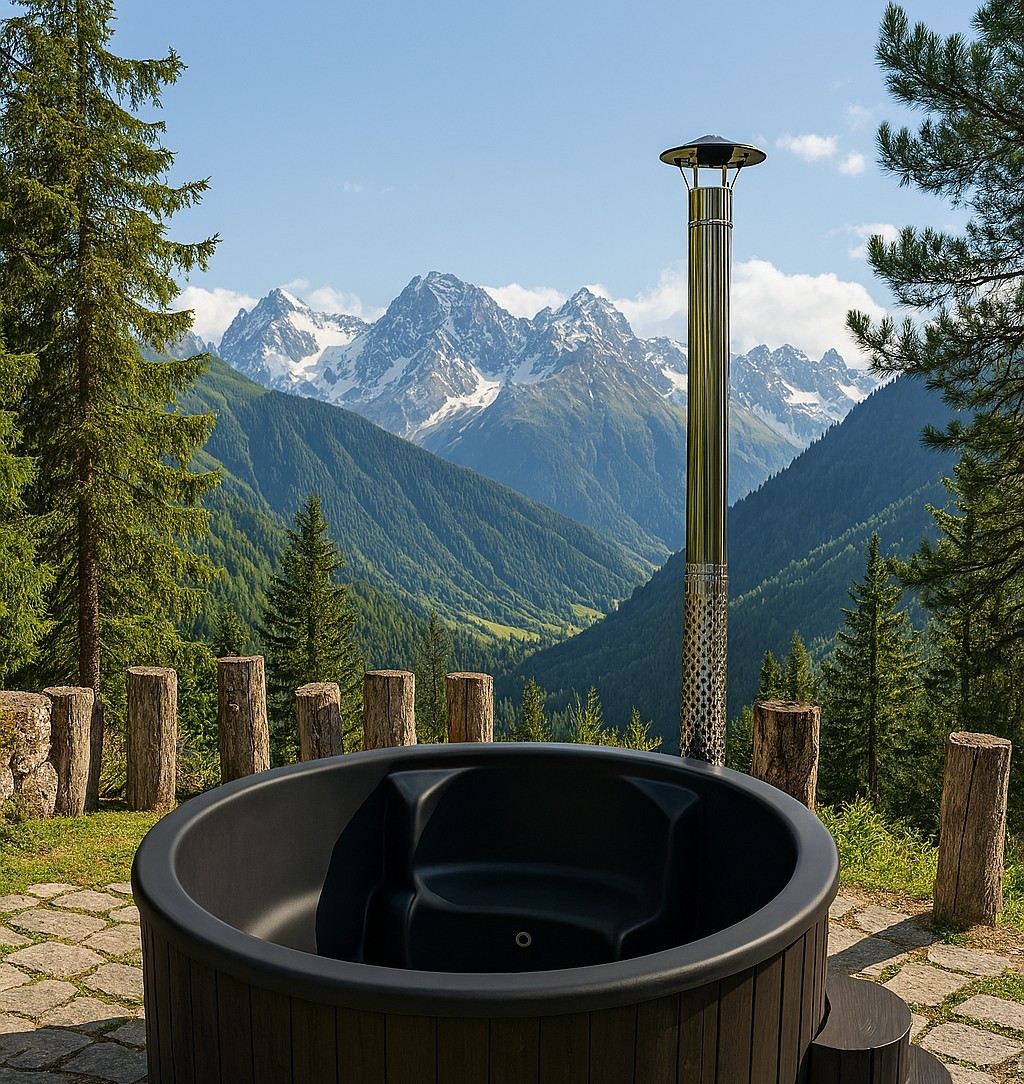 Riscaldamento tradizionale: dotata di stufa a legna integrata con canna fumaria in acciaio inox — per un'autentica esperienza di immersione calda e rilassante.